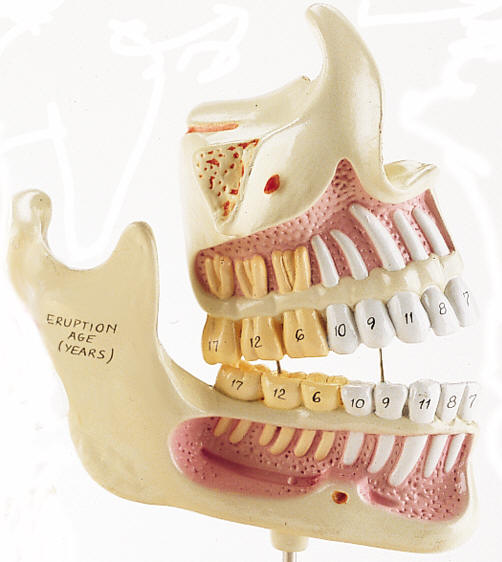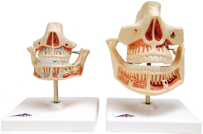 nerves exposed. The lower jaw is movable on the adult denture model.