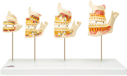 superadded permanent teeth, this series includes jaws of newborn, 5-year-old, 9-year-old and adult. Overall dimension 9 x 18 x 4 inches. |