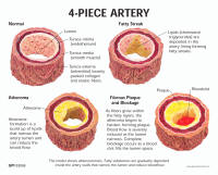 up of fatty tissue (cholesterol) and plaque. 4-stages: normal artery,