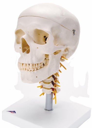 This 4-part skull is flexibly mounted on a stand with a cervical spine.