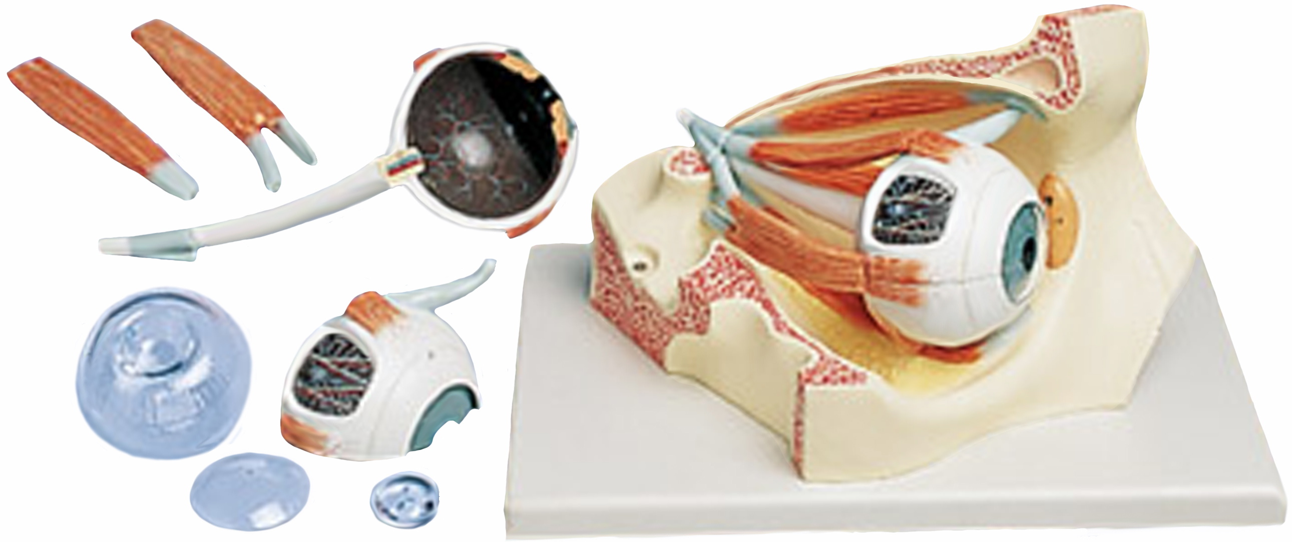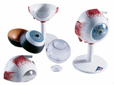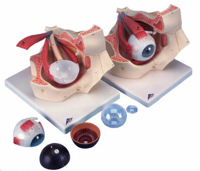 This three times life-size anatomical model of the eye dissects into: both