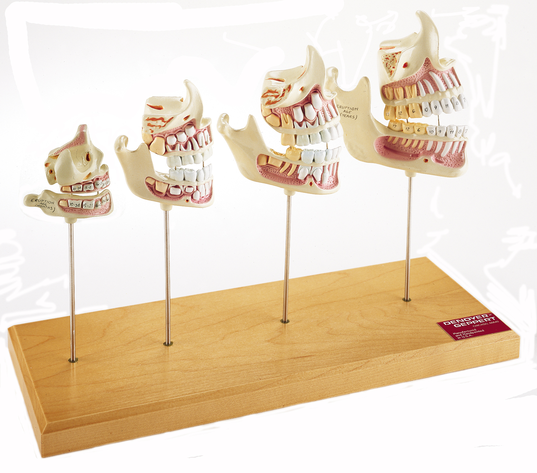 superadded permanent teeth, this series includes jaws of newborn, 5-year-old, 9-year-old and adult. Overall dimension 9 x 18 x 4 inches. |