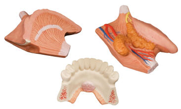This 4-part model of the tongue shows the lower jaw up the second molar,