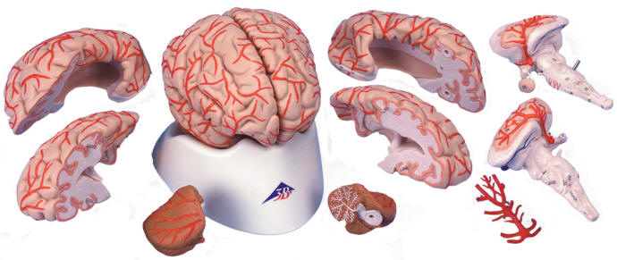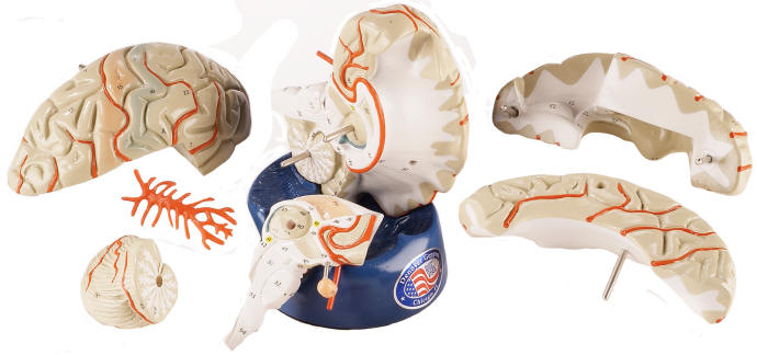 illustrate arteries (red) and cranial nerves (yellow). Dissects into