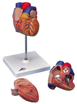 This sturdy colored two-piece, life-size anatomical heart model divides