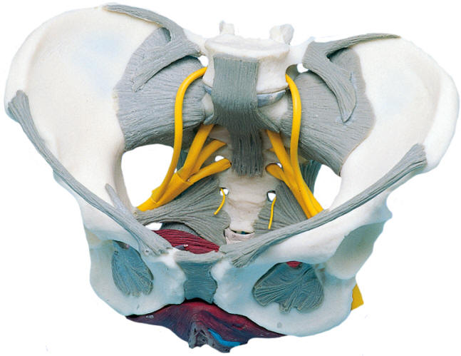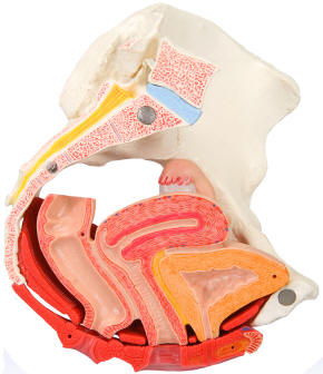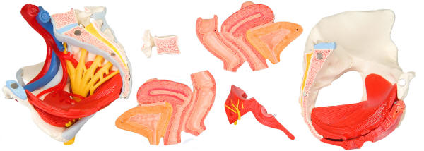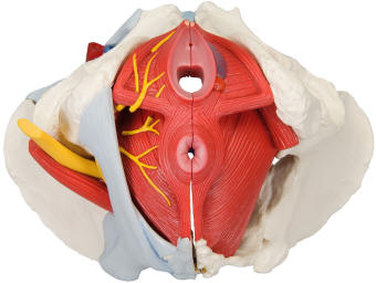 This life size six part model of a female pelvis represents detailed information about the topography of bones, ligaments, vessels, nerves, pelvic floor muscles and female genital organs. It presents the whole pelvic floor with partially removable midsagitally sectioned external anal sphincter, external urethral sphincter, deep and superficial transverse perineal and bulbospongiosus.