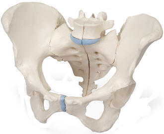This life size three part model represents an original cast of a bony female pelvis and shows all the details of the following anatomical structures: Two hip bones, the pubic symphysis, the sacrum and the coccyx, the fifth lumbar vertebra with intervertebral disc.  A midsagital section through the fifth lumbar vertebra, sacrum and coccyx, allow both halves of the pelvis to be disassembled revealing a part of the cauda equina in the vertebral canal. The left half of the fifth lumbar vertebral body is removable.