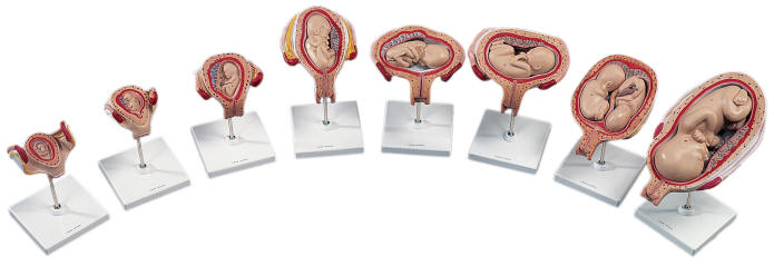 A set of five models. 1st, 2nd and 3rd Month Embryos and 5th and 7th